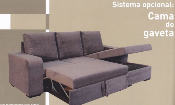 Sofás: Redondela, Paula, Carmen e Tubarão são possíveis de acrescentar gaveta opcional para sofá cama, disponível em várias cores de tecido e microfibra.